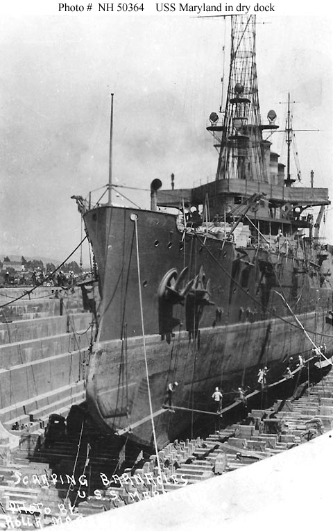 Photo #: NH 50363 USS Maryland (Armored Cruiser # 8) In dry dock with her bottom cleaned and freshly painted, circa 1911. Courtesy of Lloyd Harmon. U.S. Naval History and Heritage Command Photograph. Online Image: 79KB; 510 x 765 pixels |