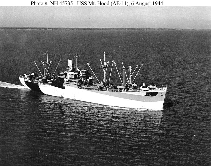 Photo #: NH 45735 USS Mount Hood (AE-11) Underway in Hampton Roads, Virginia, 6 August 1944. U.S. Naval Historical Center Photograph. Online Image: 124KB; 740 x 580 pixels |