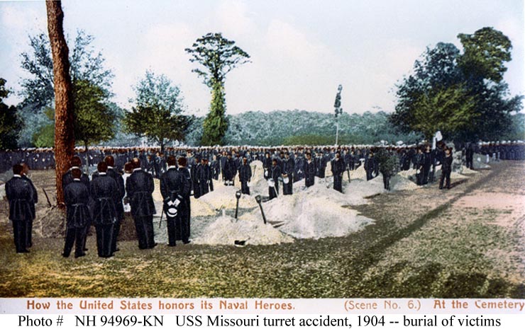 Photo #: NH 94969-KN (Color) USS Missouri (BB-11) Turret Fire, 13 April 1904 Color-tinted photograph, printed on a postal card, showing the burial ceremonies for the victims of the tragedy. The original postcard was published by the American News Company as Number 6 in the series How the United States honors its Naval Heros. Courtesy of Commander Donald J. Robinson, USN(MSC), Retired, 1983. U.S. Naval Historical Center Photograph. Online Image: 101KB; 740 x 465 pixels |