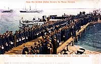 Photo #: NH 101213-KN (Color) USS Missouri (BB-11) Turret Fire, 13 April 1904 Color-tinted photograph, printed on a postal card, showing the bodies of the victims of the tragedy being landed for burial. The original postcard was published by the Rochester News Company as Number 3 in the series How the United States honors its Naval Heros. Courtesy of Commander Donald J. Robinson, USN(MSC), Retired, 1984. U.S. Naval Historical Center Photograph. Online Image: 103KB; 740 x 490 pixels |