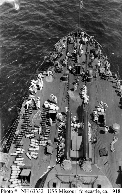 Photo #: NH 63332 USS Missouri (BB-11) View of the ship's forecastle, seen from her foremast top, showing 12-inch shells on deck being prepared for target practice, circa 1918. The battleship's forward 12"/40 gun turret is also seen. U.S. Naval Historical Center Photograph. Online Image: 102KB; 480 x 765 pixels |