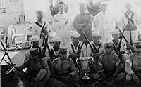 Photo #: NH 101539 USS Missouri (BB-11) Sailors and Marines of the ship's Rifle Team, posing with a trophy and Krag-Jorgensen rifles, circa 1909. Note Gun Pointer, First Class, and former-Naval Apprentice marks worn by the men kneeling in the center. Collection of Chief Quartermaster John Harold, USN. U.S. Naval Historical Center Photograph. Online Image: 72KB; 740 x 485 pixels |