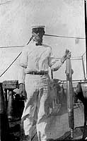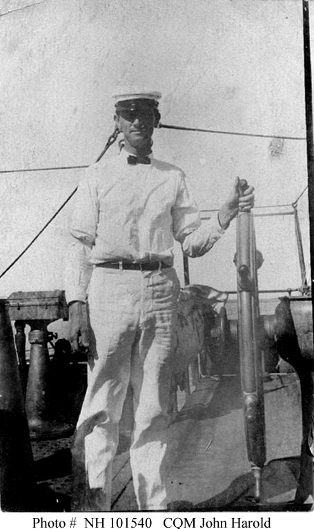 Photo #: NH 101540 Chief Quartermaster John Harold, USN. Poses with a steering wheel on USS Missouri (BB-11), circa 1909. Collection of Chief Quartermaster John Harold, USN. U.S. Naval Historical Center Photograph. Online Image: 67KB; 455 x 765 pixels |