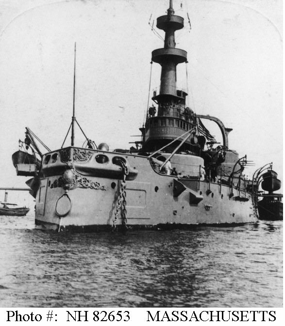USS Massachusetts, a 10,288-ton battleship of the Indiana class, was built at Philadelphia, Pennsylvania, and commissioned in June 1896. Until 1898, she served along the U.S. east coast. The Spanish-American War took her to the West Indies, where she participated in blockade duty off Cienfuegos and Santiago, Cuba, and later operated off Puerto Rico.