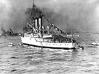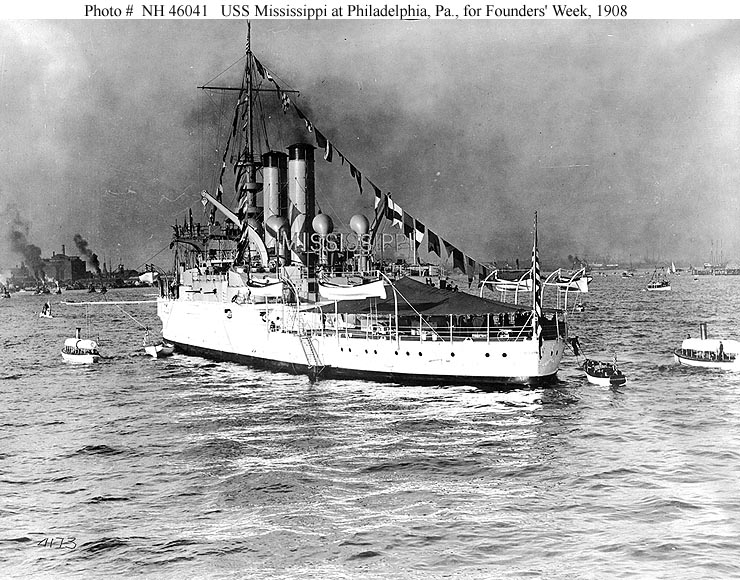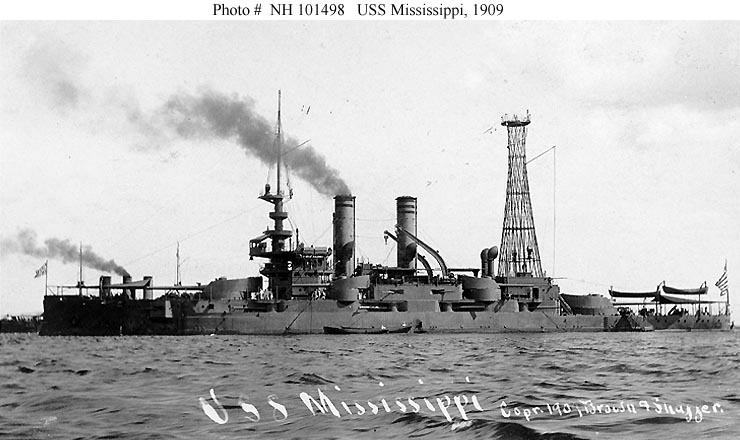 USS Mississippi, first of a class of two 13,000-ton battleships, was built at Philadelphia, Pennsylvania. She was commissioned in February 1908 and spent her first few years of service operating along the U.S. east coast and in the Caribbean area. In addition, in May 1909, the battleship cruised up the Mississippi River to demonstrate contemporary naval technology to the citizens of the south-central United States.