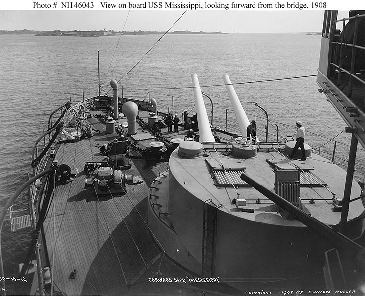 Photo #: 19-N-60-10-14 USS Mississippi (Battleship # 23) View on the foredeck, looking aft, with the forward 12"/45 gun turret trained to starboard, 1908. Note: anchor chain and capstans; hatches; bridge structure with ship's bell attached below its forward end. Photographed by Enrique Muller. Photograph from the Bureau of Ships Collection in the U.S. National Archives. Online Image: 117KB; 740 x 610 pixels Reproductions of this image may also be available through the National Archives photographic reproduction system. |