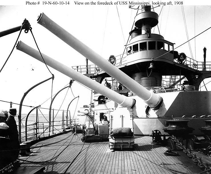 Photo #: 19-N-14910 USS Mississippi (Battleship # 23) "Cleared for action" in 1908, soon after she was completed. Photograph from the Bureau of Ships Collection in the U.S. National Archives. Online Image: 77KB; 740 x 600 pixels Reproductions of this image may also be available through the National Archives photographic reproduction system. |