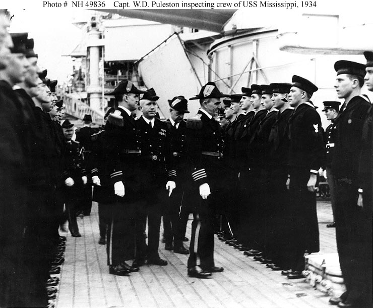 Photo #: NH 49836 USS Mississippi (BB-41) Ship's crew being inspected by her Commanding Officer, Captain William D. Puleston (right-center), 1934. U.S. Naval History and Heritage Command Photograph. Online Image: 85KB; 740 x 610 pixels |
