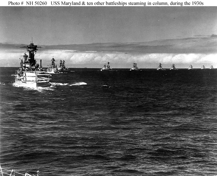 Photo #: NH 50260 U.S. Battleships at sea, circa the later 1930s Of the eleven battleships seen here, making a starboard turn while steaming in column, USS Maryland (BB-46) is at left, closest to the camera. Leading the column are the three New Mexico class (BB 40-42) battleships. U.S. Naval Historical Center Photograph. Online Image: 123KB; 740 x 600 pixels |
