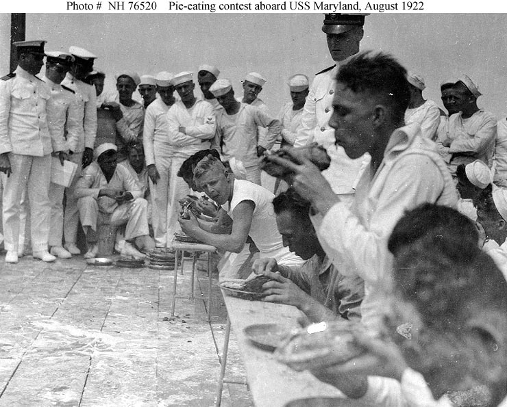 Photo #: NH 76520 USS Maryland (BB-46) Pie-eating contest on board, during her cruise to Brazil in August 1922. Donation of Mrs. F.W. Brown, 1972. U.S. Naval Historical Center Photograph. Online Image: 116KB; 740 x 595 pixels |