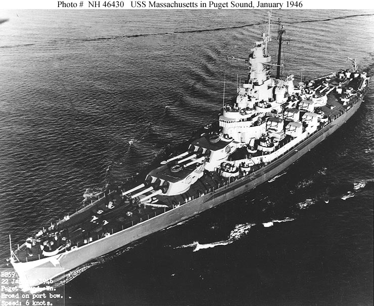 Photo #: NH 46430 USS Massachusetts (BB-59) Under way at six knots in Puget Sound, Washington, after her final overhaul, 22 January 1946. U.S. Naval History and Heritage Command Photograph. Online Image: 127KB; 740 x 605 pixels |