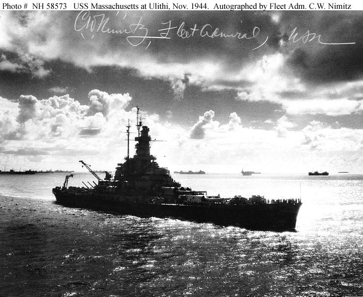 Photo #: NH 58573 USS Massachusetts (BB-59) Coming into Ulithi Anchorage on 24 November 1944, during a break in operations off the Philippines. Photographed from USS Wasp (CV-18). Fleet Admiral Chester W. Nimitz has autographed the original print. Collection of Fleet Admiral Chester W. Nimitz, USN. U.S. Naval History and Heritage Command Photograph. Online Image: 118KB; 740 x 605 pixels |