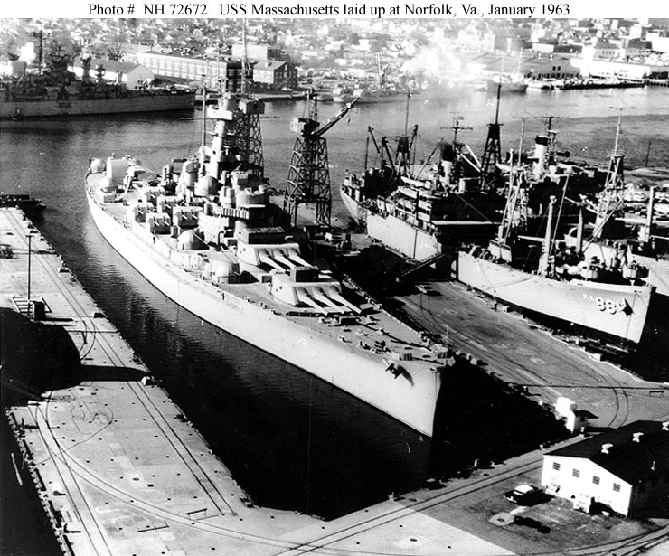 Photo #: NH 72672 USS Massachusetts (BB-59) Laid up at the Norfolk Naval Shipyard, Virginia, on 3 January 1963. At that time she had been stricken from the Naval Vessel Register, but was awaiting preservation as a memorial. USS Uvalde (APA-88) is at right. U.S. Naval History and Heritage Command Photograph. Online Image: 130KB; 740 x 615 pixels |