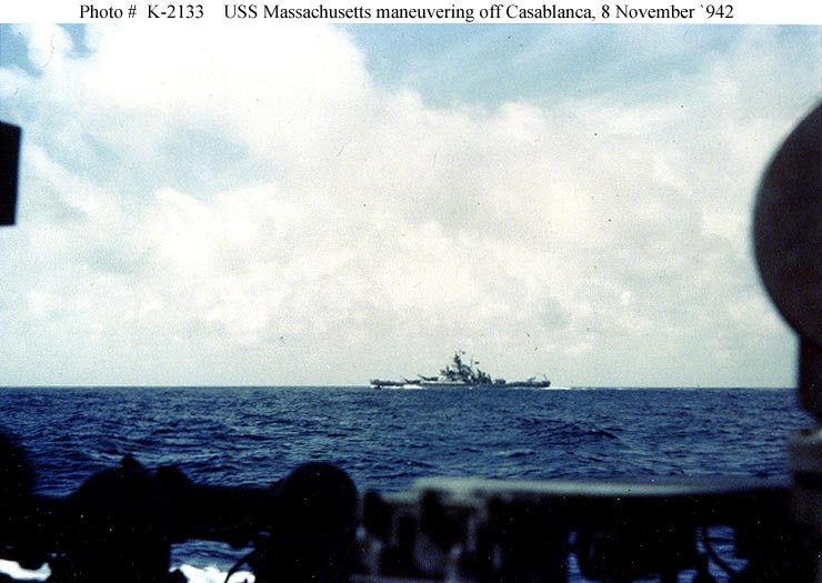 Photo #: 80-G-K-2133 (Color) USS Massachusetts (BB-59) Maneuvering off Casablanca, Morocco, during the North Africa invasion, 8 November 1942. Photographed from USS Mayrant (DD-402). Note that Massachusetts is flying two very large national ensigns. Official U.S. Navy Photograph, now in the collections of the National Archives. Online Image: 64KB; 740 x 525 pixels Reproductions of this image may also be available through the National Archives photographic reproduction system. |