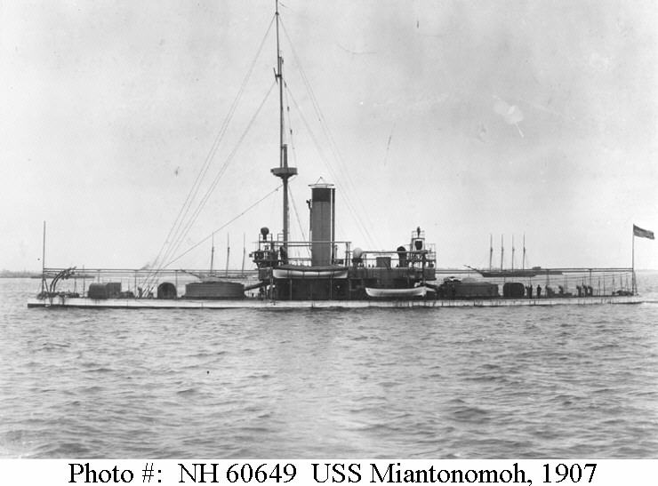 USS Miantonomoh, a 3990-ton monitor, was built at Chester, Pennsylvania, and commissioned in an incomplete state in October 1882. Construction continued at the New York Navy Yard, and she entered service in October 1891. Miantonomoh's active service was mainly spent along the U.S. east coast, but she operated off Cuba during the Spanish-American War. She was decommissioned for the last time in December 1907, but was not sold until January 1922.