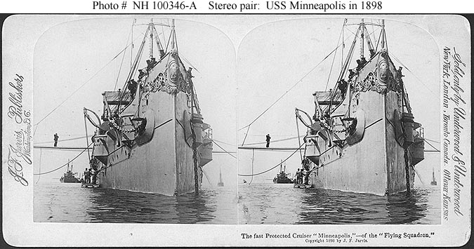 Photo #: NH 100346 USS Minneapolis (Cruiser # 13) At anchor in 1898, with USS Texas coaling in the left distance. The original photograph was published on a stereograph card by J.F. Jarvis, Washington, D.C., 1898. Note Minneapolis' bow decoration, anchor and anchor chain. Donation of Louis Smaus, 1985 U.S. Naval Historical Center Photograph. Online Image: 127KB; 645 x 675 pixels A stereo pair version of this image is available as Photo # NH 100346-A Online Image of stereo pair: 75KB; 675 x 355 pixels |