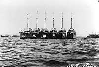 Photo #: NH 102784 22nd Destroyer Division Officers and Crews Panoramic photograph, taken on the ships' foredecks while they were moored in San Diego Harbor, California, 10 January 1920. Taken by O.A. Tunnell, San Diego. Ships are, from left to right: Note signalmen making semaphore signals from atop the ship's pilothouses. Photographs vignetted in the upper right and left of this image are reproduced as Photo #s NH 102784-A and NH 102784-B. U.S. Naval Historical Center Photograph. Online Image: 101KB; 1200 x 255 pixels |