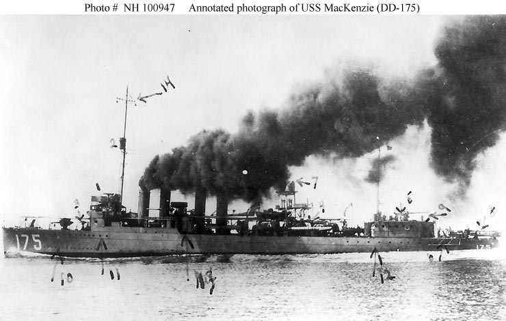 Photo #: NH 100947 USS MacKenzie (DD-175), Flagship of Destroyer Division 22 Photographed by O.W. Waterman, circa 1920-1922. The original print was annotated to identify features: Courtesy of Carter Rila. U.S. Naval Historical Center Photograph. Online Image: 62KB; 740 x 470 pixels< |