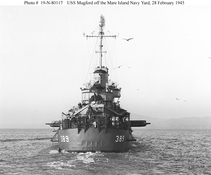 Photo #: 19-N-80117 USS Mugford (DD-389) Off the Mare Island Navy Yard, California, 28 February 1945. Her torpedo tubes are trained out on both sides of the ship. Note depth charge tracks on her stern, with her name faintly visible below them. Photograph from the Bureau of Ships Collection in the U.S. National Archives. Online Image: 76KB; 740 x 615 pixels Reproductions of this image may also be available through the National Archives photographic reproduction system. |