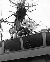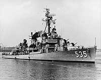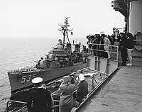 USS Miller (DD-535) underway at sea, 17 April 1958. Photographed by Cobb, of USS Tarawa (CVS-40). Port bow surface view, taken from about the height of the ship's superstructure top. USS Miller (DD-535) refueling at sea, 7 September 1958.. Nearly bow-on aerial view, with Miller steaming alongside (and to starboard of) USS Boston (CAG-1) and USS Saratoga (CVA-60). The carrier dominates the view, while Miller occupies a relatively small part of the photo's left side. USS Miller (DD-535) underway at sea, 1 June 1961. Photographed by C. Snell. Starboard bow low aerial view, taken from about the height of the ship's foremast top. USS Miller (DD-535) underway at sea, 2 November 1961. Starboard bow surface view, taken from about the height of the ship's forward gun director. USS Miller (DD-535) underway at sea, 16 December 1961. Photographed by C. Snell. Starboard bow low aerial view, taken from about the height of the ship's foremast top, showing Miller steaming through the wake of another ship. Reproductions of these images should be available through the National Archives photographic reproduction system for pictures not held by the Naval Historical Center. The images listed in this box are NOT in the Naval Historical Center's collections. DO NOT try to obtain them using the procedures described in our page "How to Obtain Photographic Reproductions". |