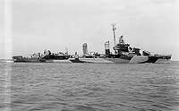 Photo #: 19-N-30842 USS Meade (DD-602) Off New York City, 20 June 1942, probably during her delivery voyage from the Bethlehem Steel Company shipyard at Staten Island. The ship, which is flying her builder's flag, was commissioned two days later. Note her pattern camouflage. Photograph from the Bureau of Ships Collection in the U.S. National Archives. Online Image: 81KB; 740 x 465 pixels Reproductions of this image may also be available through the National Archives photographic reproduction system. |