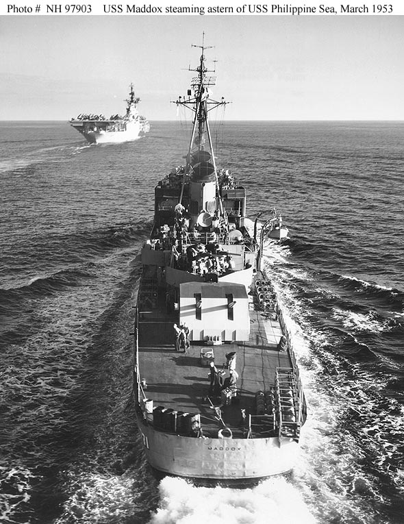 Maddox began the post-World War II era by transporting veterans from the Far East to the United States. She again operated in Asian waters in 1946-47 and had just started another tour there when the Korean War broke out in late June 1950. For the rest of the year, she supported the United Nations forces in Korea, performing escort, blockade and bombardment missions, and also took part in patrols between Taiwan and mainland China. Maddox had similar duties during two subsequent Korean War cruises and deployed to the western Pacific for Seventh Fleet duty seven more times between 1954 and 1962.