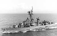 USS Maddox, a 2200-ton Allen M. Sumner class destroyer, was built at Bath, Maine. She was commissioned in early June 1944, went to the Pacific toward the end of August and entered combat as an escort for Task Force 38's fast carriers during their strikes in the Philippines and South China Sea areas from November 1944 into January 1945. While off Formosa on 21 January, Maddox was hit by a Japanese suicide plane that killed seven of her crewmen. This damage kept her out of action for nearly two months, but the destroyer was able to assist the carriers during their March 1945 raids on Japan. She spent the remaining five months of the Pacific War supporting the Okinawa campaign and participating in further attacks on the Japanese home islands.