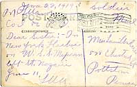 Photo #: NH 105718-A-KN (color) USS Mexican (ID # 1655) Reverse of a post card, dated 22 June 1919, mailed by a homeward-bound Soldier upon his arrival in New York Harbor on board the ship. The message reports that Mexican sailed from St. Nazaire, France, on 11 June 1919. See Photo # NH 105718 for the photo of USS Mexican seen on the front of this postcard. Donation of Dr. Mark Kulikowski, 2008. U.S. Naval History and Heritage Command Photograph. Online Image: 89KB; 740 x 495 pixels |