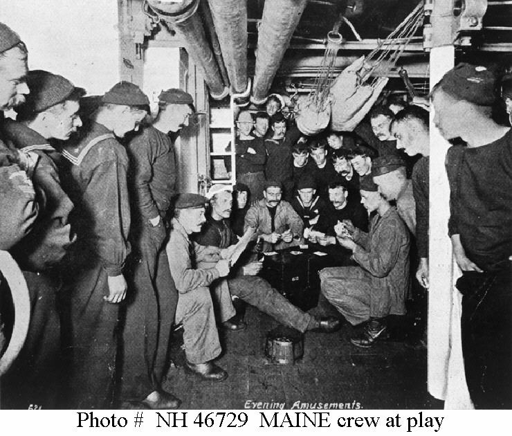 Photo #: NH 46729 USS Maine (1895-1898) "Evening Amusements": crewmembers playing cards and reading in their berthing spaces, circa 1895-1898. Halftone photograph, copied from the contemporary publication Uncle Sam's Navy, 1898. U.S. Naval Historical Center Photograph. Online Image: 94,594 bytes; 740 x 630 pixels |