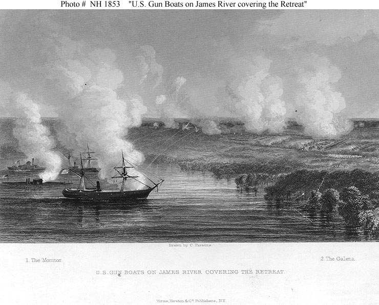 Photo #: NH 1853 "U.S. Gun Boats on James River covering the Retreat." Engraving after a drawing by C. Parsons, published by Virtue, Yorston & Company, New York, circa the later 19th Century. It depicts the ironclads Monitor and Galena bombarding Confederate forces as General McClellan's army withdraws following the Battle of Malvern Hill, 2 July 1862. The other two ships visible are probably USS Aroostook (beyond Monitor's bow) and USS Jacob Bell (behind Monitor, at left). U.S. Naval Historical Center Photograph. Online Image: 97KB; 740 x 595 pixels |
