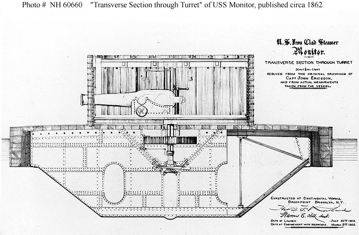 Photo #: NH 60660 USS Monitor (1862) Transverse hull section through the turret. Engraving published circa 1862, based on John Ericsson's drawings, and measurements taken from the ship. U.S. Naval Historical Center Photograph. Online Image: 86KB; 740 x 485 pixels |