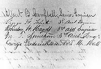 Photo #: NH 82579 USS Monitor (1862) Reverse side of a letter from the ship's officers to Commander Thomas H. Stevens, on the occasion of his detachment as her Commanding Officer. Dated 10 September 1862, at Newport News, Virginia, this side is signed by Second Assistant Engineer Albert B. Campbell, Third Assistant Engineer George H. White, Third Assistant Engineer Robinson W. Hands, Third Assistant Engineer Mark T. Sunstrom and Acting Master's Mate George Frederickson. See Photo # NH 82578 for a view of the letter's front side. U.S. Naval Historical Center Photograph. Online Image: 105KB; 740 x 530 pixels |