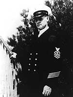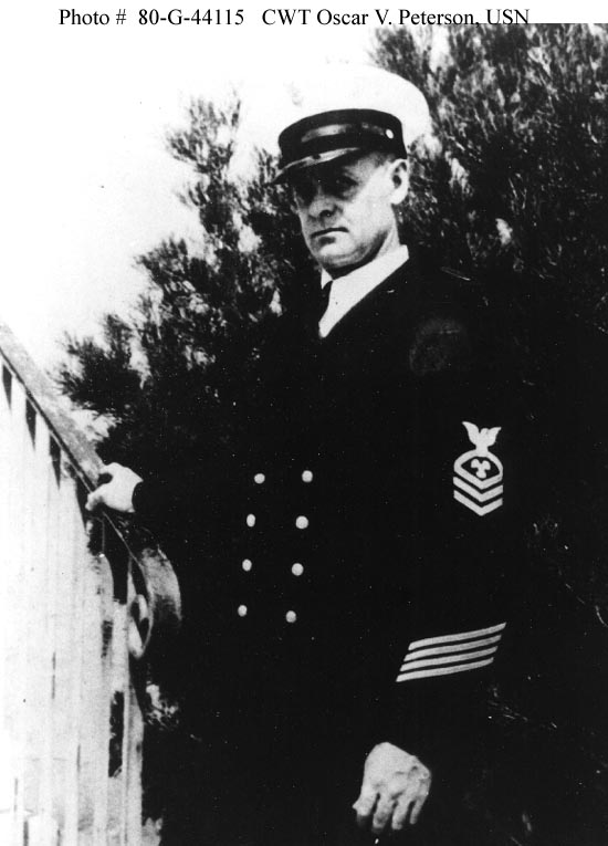 Photo #: 80-G-44115 Chief Water Tender Oscar Verner Peterson, USN Photographed circa the later 1930s. He was posthumously awarded the Medal of Honor for heroism in attempting to save USS Neosho (AO-23) after she was bombed during the Battle of Coral Sea, 7 May 1942. USS Peterson (DE-152) was named in his honor. Official U.S. Navy Photograph, now in the collections of the U.S. National Archives. Online Image: 56KB; 550 x 765 pixels Reproductions of this image may also be available through the National Archives photographic reproduction system. |