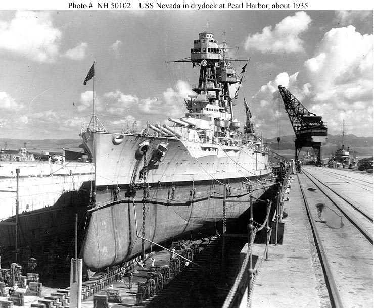 Photo #: NH 50102 USS Nevada (BB-36) In Dry Dock Number 1 at the Pearl Harbor Navy Yard, Hawaii, circa 1935. Note men painting her boot topping from stages rigged over the side, and outline of her anti-torpedo "blister" where it merges with her forward hull. U.S. Naval Historical Center Photograph. Online Image: 111KB; 740 x 610 pixels |