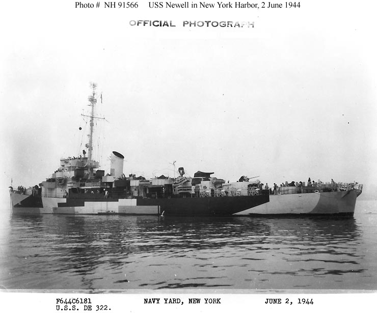 USS Newell, a 1200 ton (standard displacement) Edsall class escort ship, was built at Orange, Texas. Commissioned in late October 1943 with a U.S. Coast Guard crew, she was briefly used for training and then began trans-Atlantic convoy escort missions. While off Algeria on 20 April 1944, her convoy was attacked by German torpedo planes which sank USS Lansdale (DD-426) and the freighter Paul Hamilton and damaged three other merchantmen. Newell helped rescue survivors and tow the damaged ships into port. While in the western Mediterranean on 4 and 5 May, her convoy ran into U-boats that sank USS Fechteler (DE-157) and damaged USS Menges (DE-320) and the French escort ship Senegalais. The German submarne U-371 was also lost in this encounter.