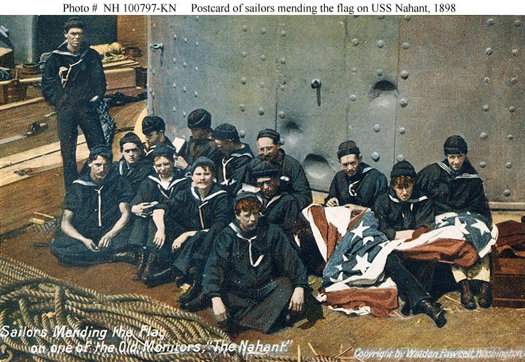 Crewmen mending the U.S. flag on deck, 1898. Dents in the ship's