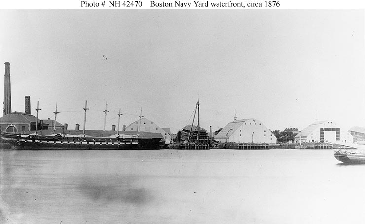 Photo #: NH 42470 Boston Navy Yard, Charlestown, Massachusetts View of the waterfront, seen from East Boston circa 1876. Ships at left are USS Wabash, outboard, with USS Niagara housed over inboard of her. USS Iowa (ex-Ammonoosuc) is inboard of Niagara with only her four smokestacks and stern visible. The large ships on the building ways in the center and extreme right are USS Connecticut (ex-Pompanoosuc), and USS Pennsylvania (ex-Kewaydin). This view forms a panorama with Photo # NH 42474. Courtesy of the Naval Historical Foundation, Washington, D.C. U.S. Naval Historical Center Photograph. Online Image: 42KB; 740 x 455 pixels |