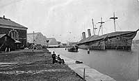 Photo #: NH 57982 Boston Navy Yard, Massachusetts View of the waterfront, about 1870. Ships laid up and housed over, on the right, are USS Iowa, ex-Ammonoosuc (1868-1883), inboard, and USS Niagara (1857-1885). On the stocks in left center, with sterns visible between and beyond the two shiphouses, are USS Connecticut, ex-Pompanoosuc, and USS Pennsylvania, ex-Kewaydin. The receiving ship USS Ohio (1838-1883) is in the middle distance. Donation of Captain Yancy S. Williams, USN, 1928. U.S. Naval Historical Center Photograph. Online Image: 96KB; 740 x 455 pixels |