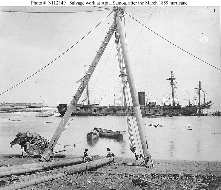 Following overhaul, Nipsic went to the Pacific by way of Cape Horn in early 1888. Later in the year she became the station ship at Apia, Samoa, providing U.S. Naval presence there during a tense period with Germany over that nation's attempts to establish a Samoan government of its choice. On 15-16 March 1889, she was in Apia Harbor during a violent hurricane that wrecked two German and two U.S. Navy warships. Nipsic and the German corvette Olga survived the storm, but both were driven ashore and seriously damaged. During the next two months, Nipsic was repaired enough to allow her to depart for Honolulu, Hawaii, where she arrived in early August 1889.