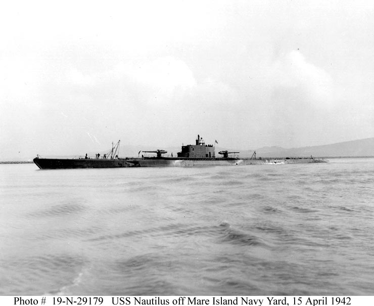 Photo #: 19-N-29177 USS Nautilus (SS-168) Off the Mare Island Navy Yard, California, 15 April 1942, following modernization. Photograph from the Bureau of Ships Collection in the U.S. National Archives. Online Image: 38KB; 740 x 555 pixels Reproductions of this image may also be available through the National Archives photographic reproduction system. |