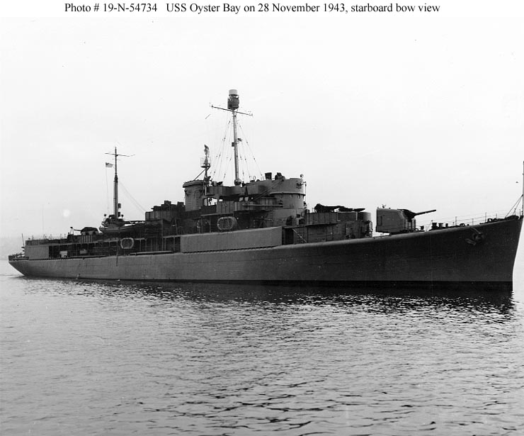 Commencing her service at Milne Bay, she served in numerous operations in the New Guinea area, supporting her PT boats and, on at least one occasion, providing gunfire support for army troops ashore. In October 1944 Oyster Bay moved to Leyte Gulf as part of the Philippine campaign. She participated in operations at several locations in the Philippines and continued to tend PT boats there for the remainder of the war. She departed the Philippines in November 1945 for inactivation at San Francisco. She was decommissioned in March 1946, stricken from the Navy List in April, and transferred to the Maritime Commission for sale in August.