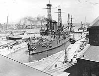 Photo #: NH 59443 USS Ohio (Battleship # 12) In Dry Dock # 2 at the Mare Island Navy Yard, California, circa 1915. USS Newport (Gunboat # 12) is also in the dry dock, astern of Ohio. Ship in the right background is USS Raleigh (Cruiser # 8). Donation of Rear Admiral Ammen C. Farenholt, USN(MC), 1932. U.S. Naval Historical Center Photograph. Online Image: 127KB; 740 x 595 pixels |