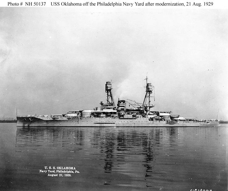 Photo #: NH 50137 USS Oklahoma (BB-37) Off the Philadelphia Navy Yard, Pennsylvania, on 21 August 1929, following modernization. U.S. Naval Historical Center Photograph. Online Image: 80KB; 740 x 620 pixels |