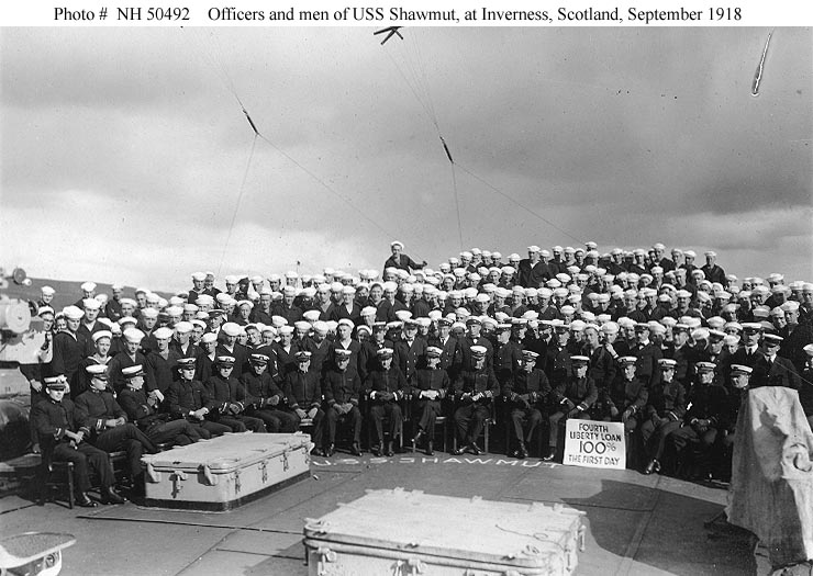 Photo #: NH 50492 USS Shawmut (ID# 1255) Ship's officers and men posed on board at Inverness, Scotland, in September 1918, after having subscribed 100% on the first day of the Fourth Liberty Loan drive. Collection of Eugene J. Grow. U.S. Naval Historical Center Photograph. Online Image: 89KB; 740 x 525 pixels |