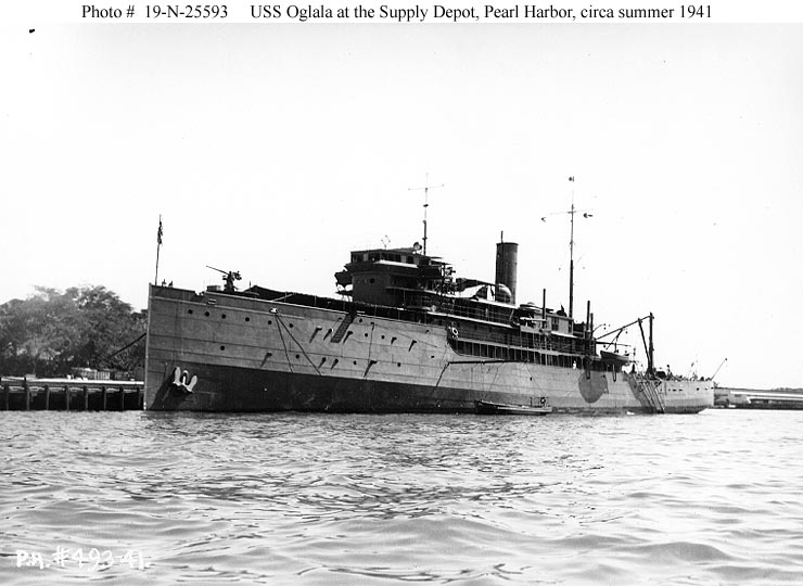 Photo #: 19-N-25593 USS Oglala (CM-4) Alongside the Pearl Harbor Supply Depot, 17 September 1941. Photograph from the Bureau of Ships Collection in the U.S. National Archives. Online Image: 65KB; 740 x 540 pixels Reproductions of this image may also be available through the National Archives photographic reproduction system. |
