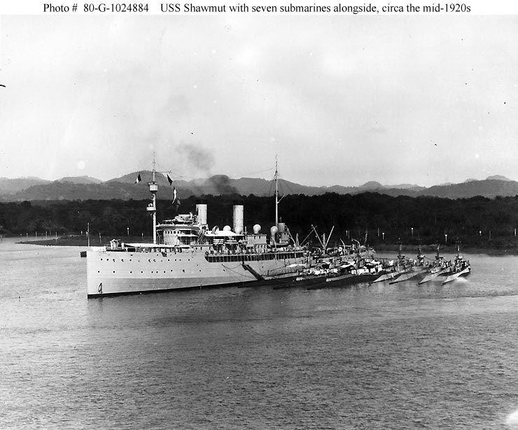 Photo #: 80-G-1024884 USS Shawmut (CM-4) At anchor with seven "S" and "R" class submarines alongside, circa the mid-1920s. Location is probably Christobal, Panama Canal Zone. Official U.S. Navy Photograph, now in the collections of the National Archives. Online Image: 85KB; 740 x 615 pixels Reproductions of this image may also be available through the National Archives photographic reproduction system. Note: The original caption identifies this ship as USS Aroostook (CM-3). However, the searchlight on her foremast, and other details, confirm that she is actually Shawmut. |