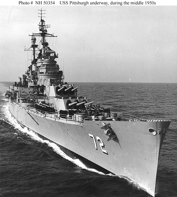Photo #: NH 50354 USS Pittsburgh (CA-72) Underway during the middle 1950s, after she had been refitted with 3"/50 anti-aircraft guns and new radars. U.S. Naval Historical Center Photograph. Online Image: 106KB; 605 x 675 pixels |