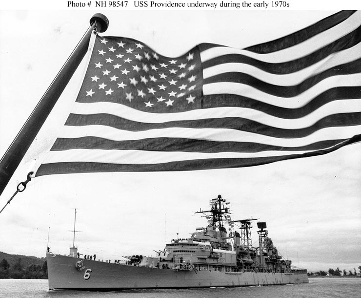 Photo #: NH 98547 USS Providence (CLG-6) Framed by the U.S. Ensign while underway in a harbor, circa the early 1970s. The original print was received in 1973. Official U.S. Navy Photograph, from the collections of the Naval Historical Center. Online Image: 83KB; 740 x 610 pixels |