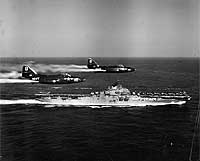 Photo #: NH 97047 USS Princeton (CV-37) Two Grumman F9F-2 "Panther" fighters dump fuel as they fly past the carrier, during Korean War operations circa May 1951. Photographed from a VC-61 plane piloted by Lieutenant (Junior Grade) George Elmies. This photograph was released by Commander, Naval Forces Far East under date of 23 May 1951. The plane on left is Bureau # 123583. Official U.S. Navy Photograph, from the "All Hands" collection at the Naval Historical Center. Online Image: 76KB; 740 x 620 pixels Note: This photo is slightly disfigured by horizontal cracking between the planes and the ship. |