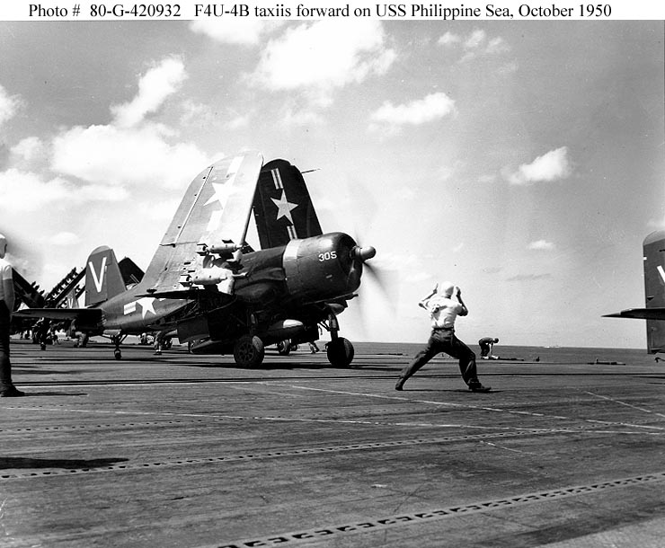 Photo #: 80-G-420932 Vought F4U-4B "Corsair", of Fighter Squadron 113 (VF-113) Taxies forward on the flight deck of USS Philippine Sea (CV-47), just before taking off to attack North Korean targets, circa 19 October 1950. Note small bombs on the plane's wings and flight deck crewman signalling to the pilot. Official U.S. Navy Photograph, now in the collections of the National Archives. Online Image: 88KB; 740 x 610 pixels Reproductions of this image may also be available through the National Archives photographic reproduction system. |